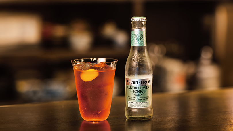 2. フィーバーツリー エルダーフラワー トニックウォーターを注いで軽くステアし、オレンジピールをふりかける。
